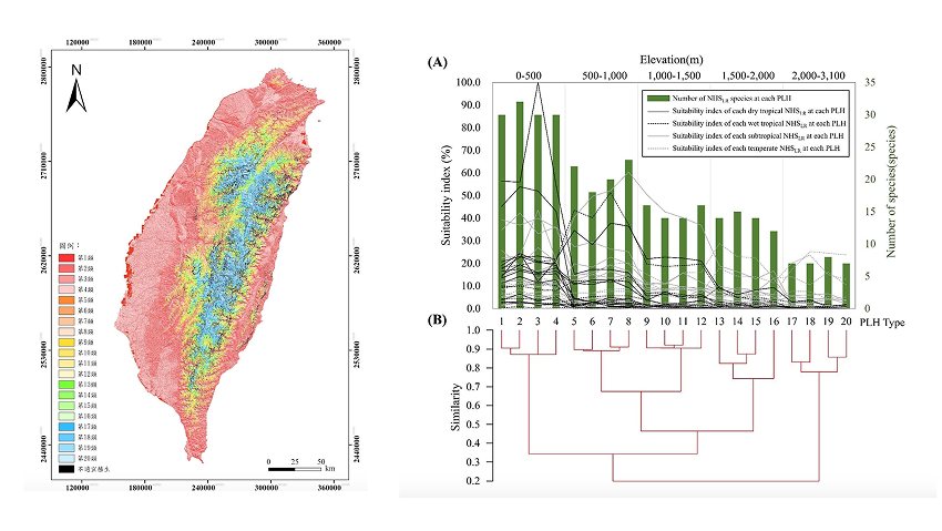 而透過文獻、現地與專家建議,本研究共篩選出42種適用於崩塌地復育的原生草類(表1),這些草類以熱帶禾本科與溫帶菊科為主,其中45%為C4植物,具耐旱、貧瘠等特性。而根據不同崩塌地的海拔變化,適用草類將由熱帶轉為亞熱帶與溫帶,且適宜性將隨之改變(圖2)。