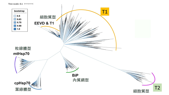 本研究聚焦於植物抗逆境熱休克蛋白70 (Hsp70) 變異體「截短熱休克蛋白70 (Hsp70T)」的功能與演化分析。Hsp70協助蛋白質正確折疊,減少逆境造成的細胞損傷。過去Hsp70T因缺乏完整C端功能域,在植物中被認定為假基因,但在酵母菌和人類中已證實參與共轉譯折疊。為釐清Hsp70T在植物中的真實功能,本研究建立大規模基因分析方法,針對192種植物與藻類進行篩選,系統性探討其分布、功能及演化歷程。研究結果發現Hsp70T廣泛分布於研究物種中,證實其並非假基因,而是具有新功能的重要基因家族。細胞質型Hsp70T最多,可分T1與T2亞型:T1型表現量少、序列變異大,在樟科植物中擴增至30個以上之基因簇;T2型數量少但序列保守,主要在種子成熟期及熱逆境下表現。基因簇分析顯示Hsp70T在陸生植物演化中大量出現,證實其在植物適應陸地環境中的關鍵角色,同時為樟科植物演化關係提供分子證據。本研究建立的大規模植物基因體比較分析方法,不僅顯示 Hsp70T 在植物中的重要角色,也為未來植物多樣性研究提供了技術參考。