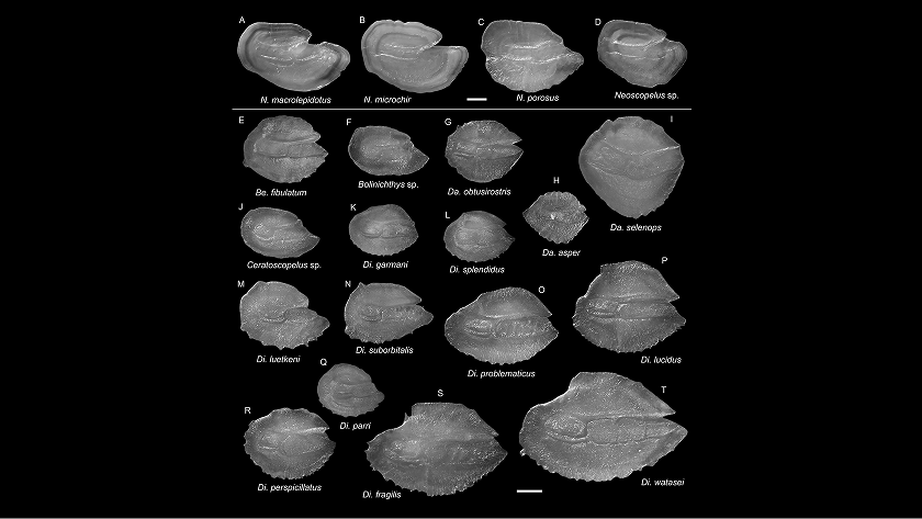 For images of teleostean otoliths, the left sagittal otoliths were primarily used; right otoliths were reversed for consistency and noted with an (R) in each caption. These otoliths were coated with a thin layer of gold using an ion sputter machine (MCM-100P, Sec, South Korea) to enhance the visibility of the sulcus. In addition, images of small-sized otoliths were captured using a scanning electron microscope (JSM-7100FLV, Jeol, Japan). Otoliths were archived at the Marine Paleontology Lab, Biodiversity Research Center, Academia Sinica, registered under the code CHLOL. Scientific names and taxonomic attributions adhere to the latest edition of the Catalog of Fishes. Our remarks provide information on species distribution and abundance estimates around Dongsha Island.