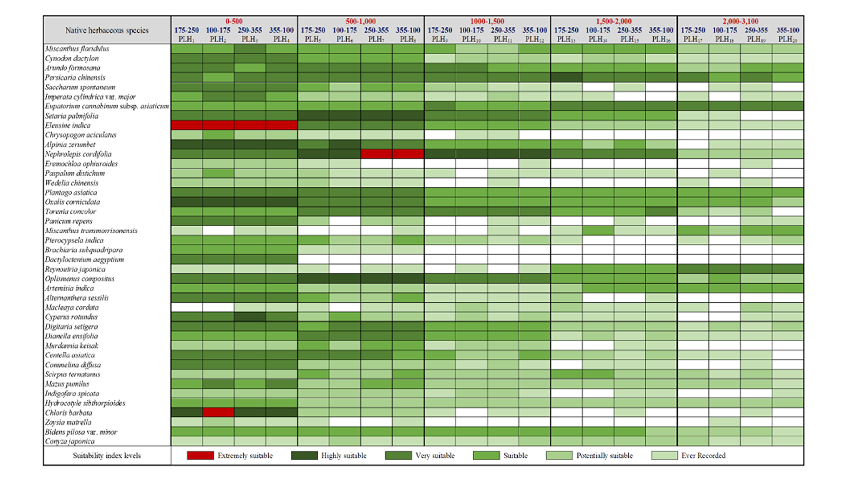 而透過文獻、現地與專家建議,本研究共篩選出42種適用於崩塌地復育的原生草類(表1),這些草類以熱帶禾本科與溫帶菊科為主,其中45%為C4植物,具耐旱、貧瘠等特性。而根據不同崩塌地的海拔變化,適用草類將由熱帶轉為亞熱帶與溫帶,且適宜性將隨之改變(圖2)。