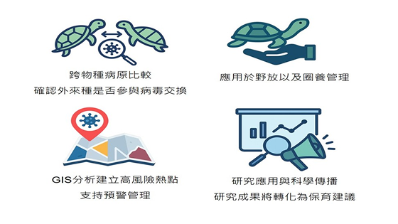 本研究與食蛇龜(Cuora flavomarginata)及柴棺龜(Mauremys mutica)的生態研究及收容單位合作,進行樣本採集與病毒感染分析。研究對象分為:(1) 原生棲地個體、(2) 野放個體、(3) 重複捕捉個體,以比較不同族群間的病毒感染狀況。
